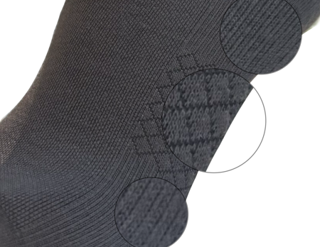 • Dubbelsömsteknik för stabilt fotvalvsstöd som ger extra komfort och gör att strumporna sitter stadigt på plats